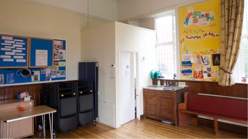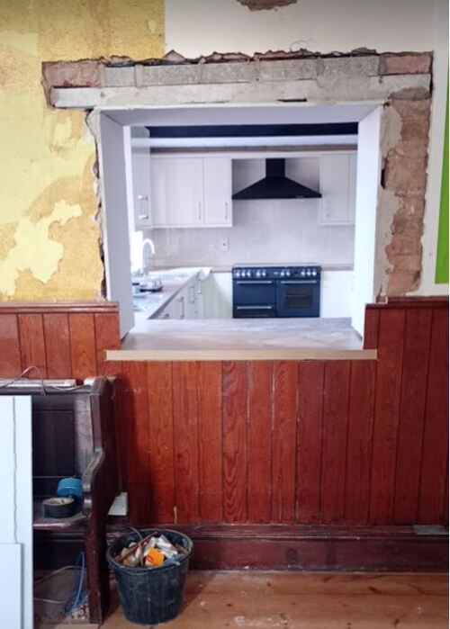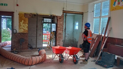 Work underway – lobby removed, store doorway opened up, cellar backfilled with hardcore and concrete slab poured to provide level access